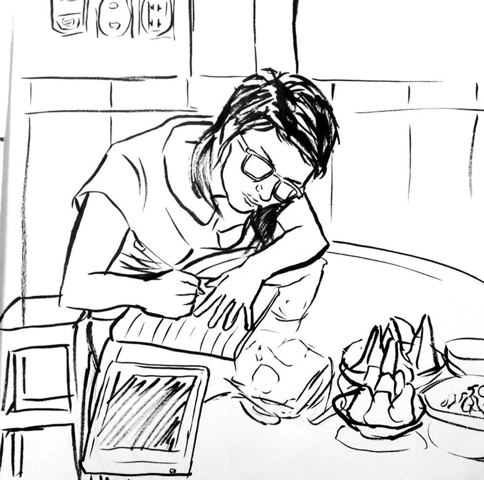 We have scripted a 31-page first chapter, and Peter is in the process of drawing, inking and lettering eleven of those pages in preparation for an art exhibit at the University of Cambridge next May. The chapter is an auto-fictional account of PQ’s parents’ escape from Saigon in 1975.